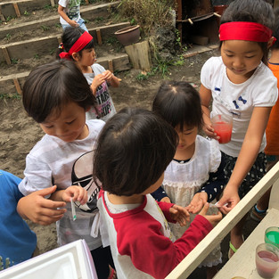 「じゅーすやさんでーす」虹の丘2018年10月16日読了時間: 1分年少組のRちゃんが、色水を混ぜて色とりどりのジュースを作りました。「いらっしゃいませ」チケットを配ると、ジュース屋さんには沢山のお客さんがやってきました。